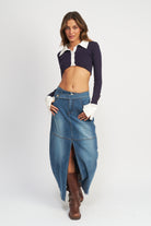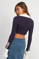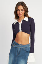 Rock preppy vibes with the ultra-cool Eastyn Contrast Collar Crop Top. It's got all the collegiate-classic feels with its contrast collar, placket, and sleeve details, and is giving a new spin on the shirt look. Throw it on with your favorite denim maxi or cargos for a cool, trend-forward look that'll have people doing a double-take!