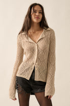 The perfect addition to any fashion-forward wardrobe, our Ferry Crochet Button Down features a unique allover crochet sweater knit design, functional button down front, and slight bell sleeves. This transitional top can play as both a shirt and a cardigan with limitless styling opportunities from Fall to Spring. Dress is up with your fave skirt or layered over a dress or dress it down with killer denim for a chic and modern boho look.